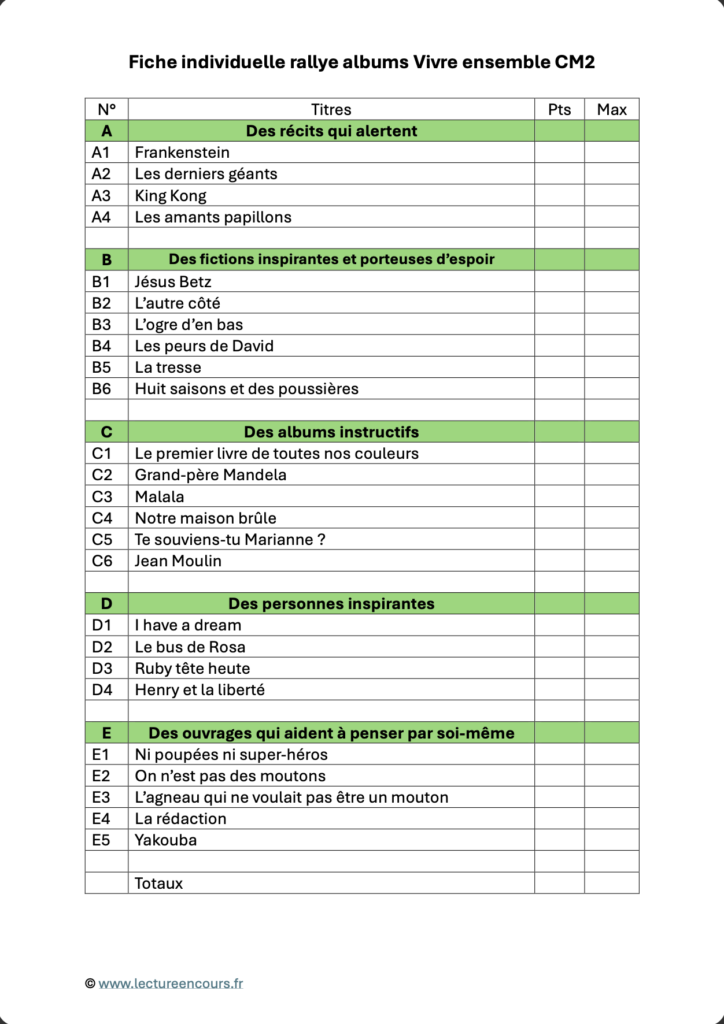 Cette feuille est à distribuer au début du rallye à chaque élève. Elle répertorie les titres des albums qui sont rangés par section, chacune indiquée par une lettre. Cette fiche sert à reporter le score obtenu pour chaque album.