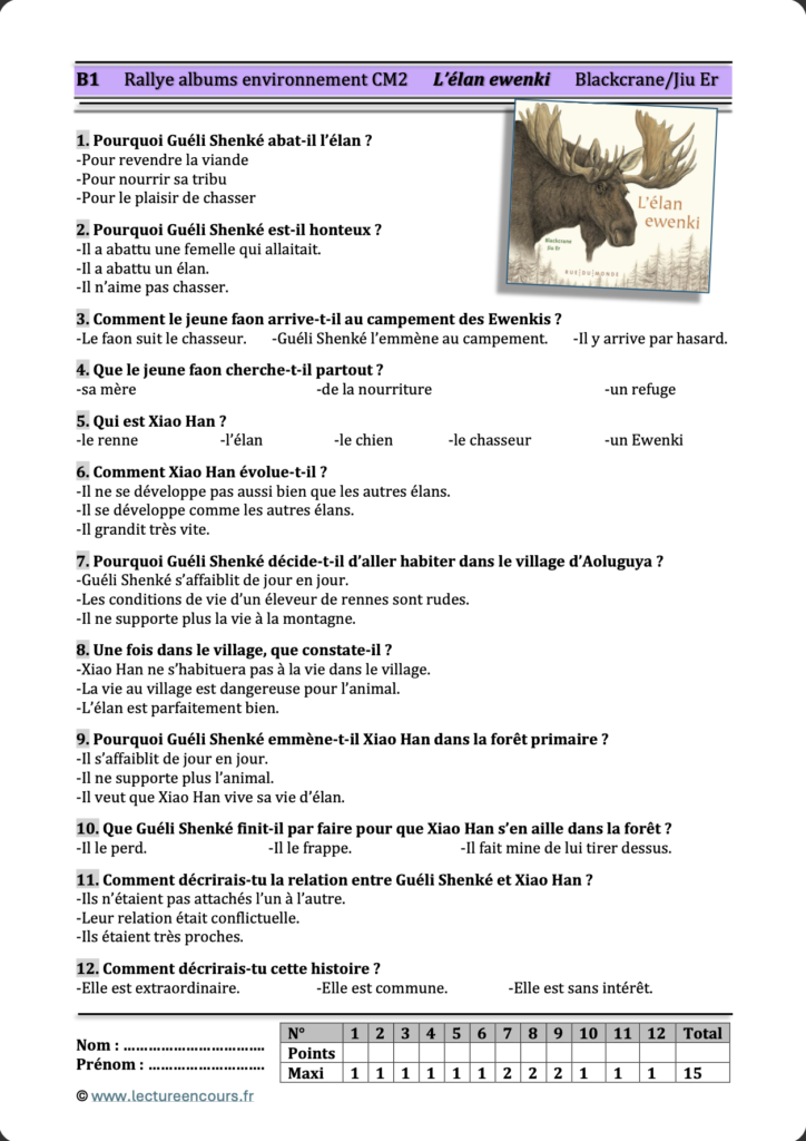 L’impression de deux exemplaires de chaque questionnaire est conseillée. Ainsi, une fois la lecture de l’album terminée, les élèves n’attendent pas après la correction de l’unique questionnaire.