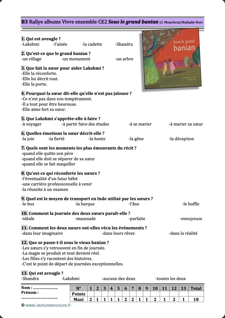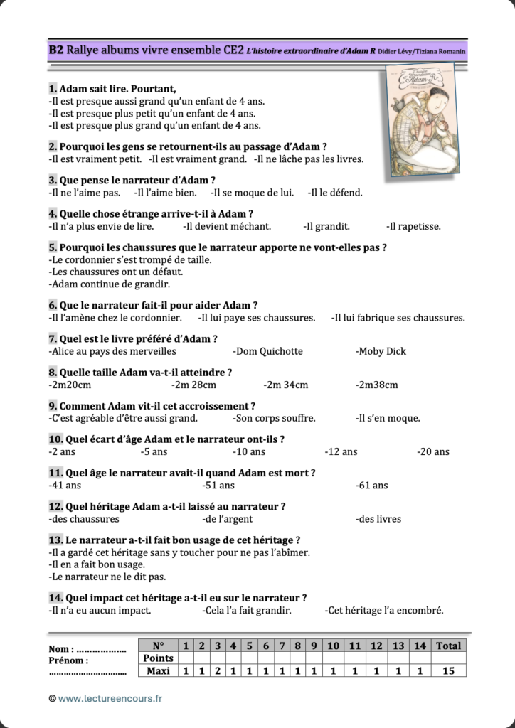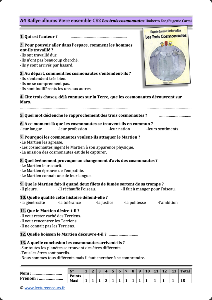 L’impression de deux exemplaires de chaque questionnaire est conseillée. Ainsi, une fois la lecture de l’album terminée, les élèves n’attendent pas après la correction de l’unique questionnaire.