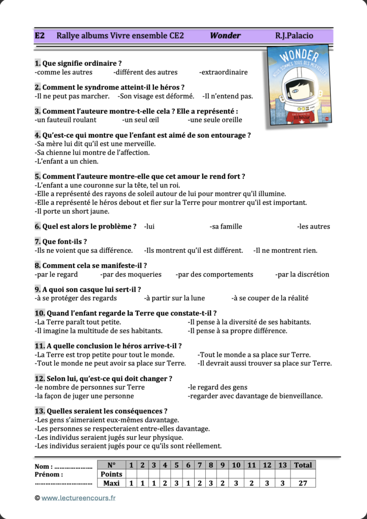 Les questionnaires de ce rallye albums Vivre ensemble CE2 ont été élaborés de façon à amener les élèves à aborder différents sujets comme la différence, le handicap, le harcèlement, le racisme et mettre en avant la tolérance, la résistance, la solidarité, l’indépendance d’esprit.